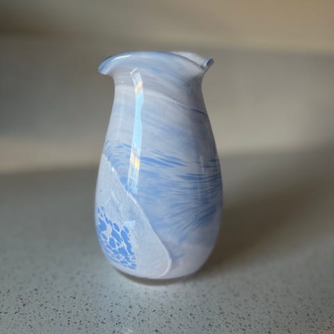 Kan brukes både som vase og dekorativ bolle. Passer godt i interiør med retro-, vintage- eller kunstglass-preg.