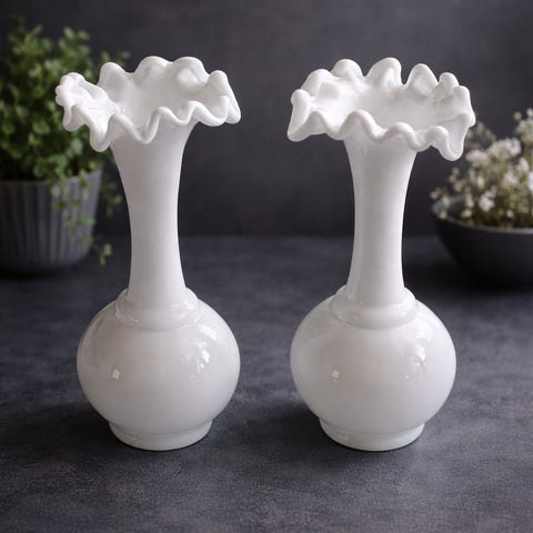 Dekorativ glasskål vase i opalhvitt glass med grønne mønstre. Vasen har et mykt, organisk uttrykk og gir et flott blikkfang både alene og med blomster. Fremstår som håndlaget med fine detaljer i glasset. Ingen synlige skader eller sprekker.