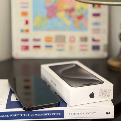 Apple iPhone 15 Pro mobiltelefon med 128 GB lagringskapasitet. Kameraet er veldig bra!