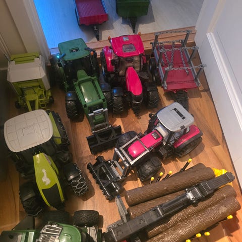 Bruder traktor med tilhenger og frontlaster. Leker for barn som simulerer landbruksaktiviteter. Laget i plast med detaljer som etterligner ekte traktor og tilhenger.