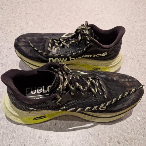 New Balance FuelCell løpesko i størrelse 42. Skoene har en hvit overdel med oransje såle, designet for løping. Materialet og konstruksjonen er tilpasset for sportsbruk.