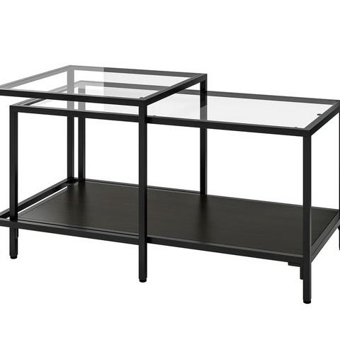 IKEA Alfred Homann sofabord med metallramme og glassplate. Designet for bruk i stue eller oppholdsrom, egnet for oppbevaring og plassering av gjenstander.