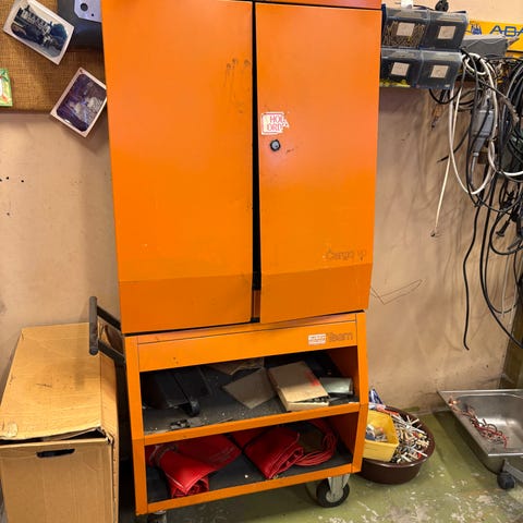 Stålskap laget i rustfritt stål med lås og to kontrollknapper (rød og grønn). Skapet har mål på omtrent 28 cm bredde, 70 cm høyde og 25 cm dybde. Egnet for oppbevaring av elektrisk utstyr eller andre gjenstander som krever sikring og kontroll.