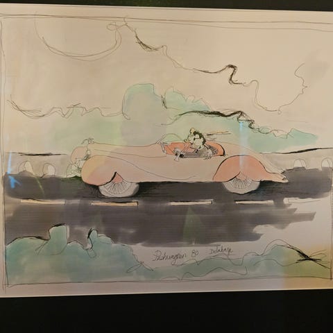 Originalt verk av Pushwagner, utført i tusj og akvarell på papir, signert nede til høyre. Et figurativt og uttrykkssterkt motiv med karakteristiske Pushwagner-figurer og arkitektoniske elementer, presentert i et scenisk og narrativt univers.