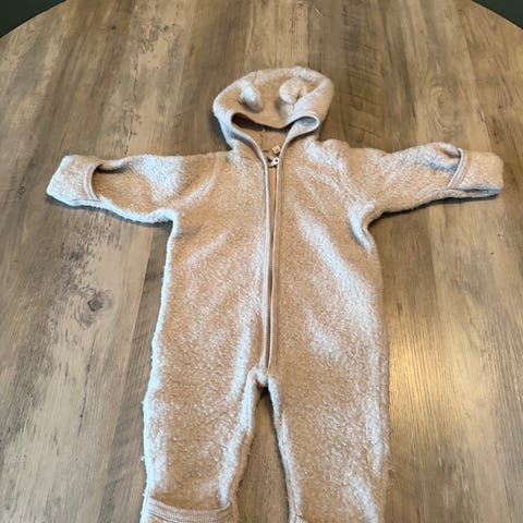 Selger en fint brukt ullfleece fra huttelihutt i fargen dusty rose. Str 68-74. Armer og bein kan brettes inn.