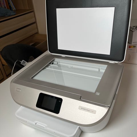 HP ENVY Photo 7134 multifunksjonsskriver i hvit farge. Enheten støtter utskrift, skanning og kopiering, og har et kompakt design som passer for hjemmebruk eller små kontorer. Trenger blekkpatroner til skriveren.