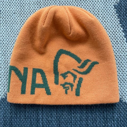 The North Face lue i flerfarget design. Luen har en pompom på toppen og et mønster i flere farger. Materiale er bomull.