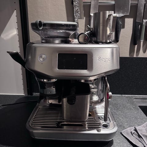 Sage espressomaskin med kvern og tilbehør svært god stand Selger en Sage espressomaskin i rustfritt stål med innebygd kaffekvern.