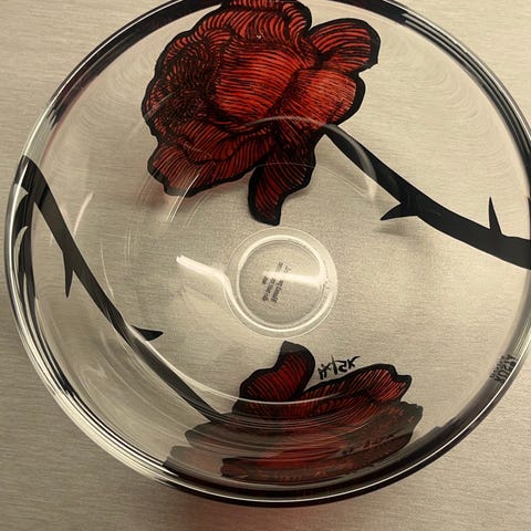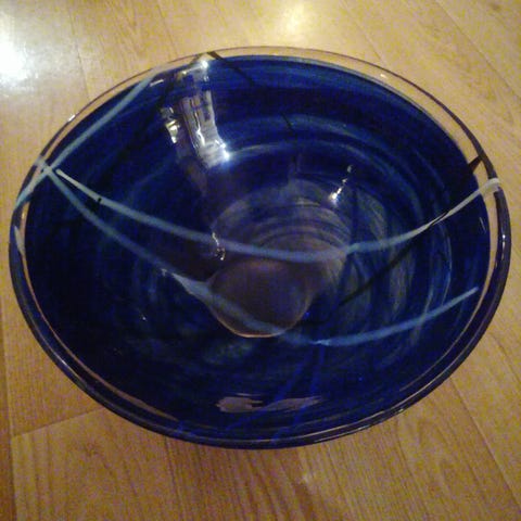 Kosta Boda glasskål i blå farge. Skålen er laget av glass og har et dekorativt mønster i blått. Egnet som dekorativt element eller til servering.