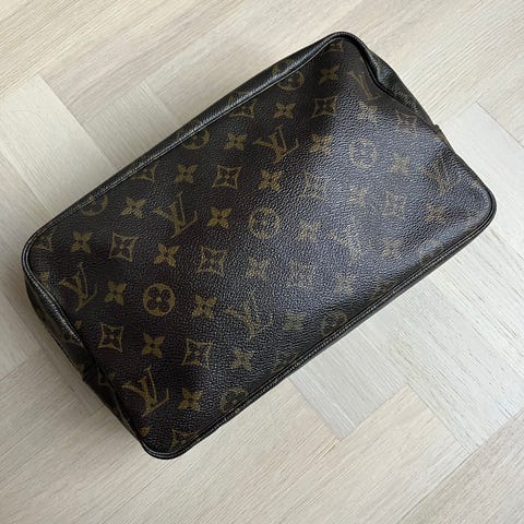Louis Vuitton lær veske for unisex. Vesken har et rutemønster i svart og grått, laget i lær. Den har glidelås og en kompakt, rektangulær form som egner seg til oppbevaring av personlige eiendeler.