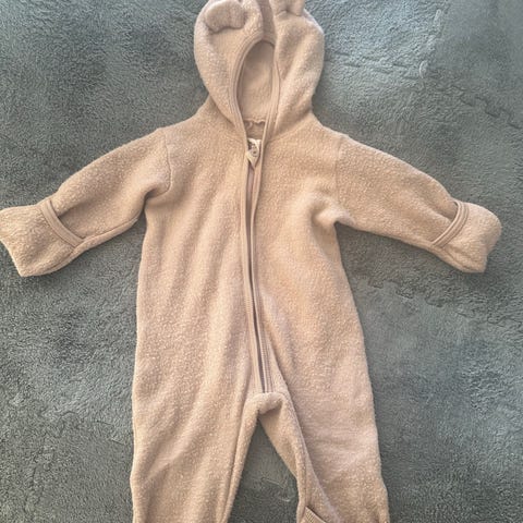 HUTTEliHUT babyheldress i størrelse 68, laget av merinoull. Dressen er beige og. Den har hette og glidelås foran, egnet for å holde barnet varmt.