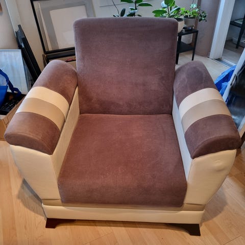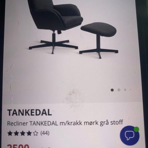 Lenestol med fotskammel fra jysk, "som ny" selges for 1000 kr. Kjøpte for 2000