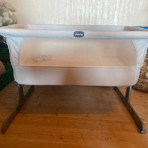 Chicco bedside crib designet for å plasseres inntil foreldreseng. Laget i lyse farger med mesh-sider for god ventilasjon og oversikt. Passer for spedbarn og små barn, gir enkel tilgang til barnet under søvn.