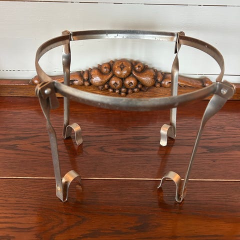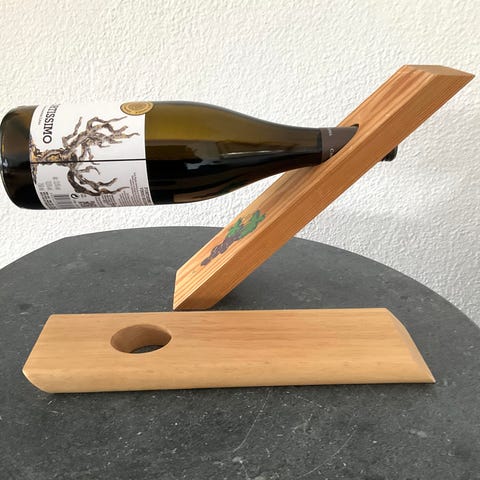 Jeg selger dette stativet i tre med to glassflasker til for eksempel olje og eddik. Flaskene har mørke røde skrukorker i plast med helletut.