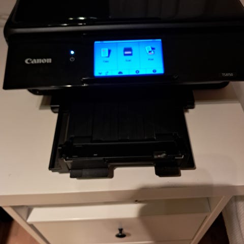 Canon Pixma MG7150 multifunksjonsskriver med skannerfunksjon. Enheten har en flatbed-skanner, fargeskjerm og støtte for utskrift, skanning og kopiering.