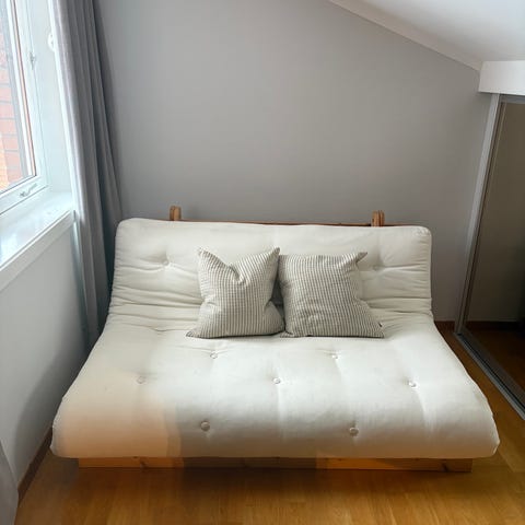 Den fungerer som sofa. Men som sovesofa må det gjøres noe med stoffet. Jeg har sydd et helt trekk som dekker benene:)