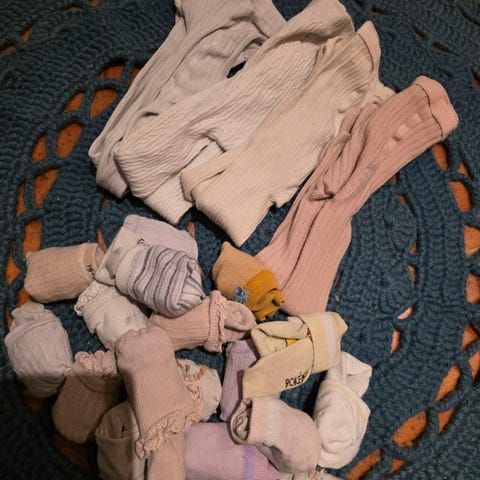 Pakke med 7 strømpebukser i størrelse 50/56. 4 er i bomull og 2 i ull/viskose. Den beige og rosa som er i ull/viskose har litt mer nupper(se bilder).