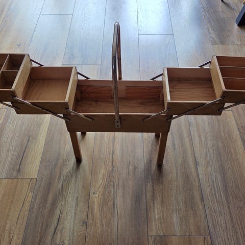Kjekt syskrin med hjul. Mangler et håndtak på ene siden. Lett fiks å sette på ett nytt om en ønsker det.