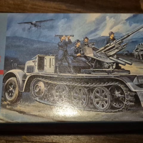Hasegawa 1/72 skala Half Track med 20 mm anti aircraft firling . Komplett, forsegla innvendig. Solid eska. Utgava frå 90 talet.