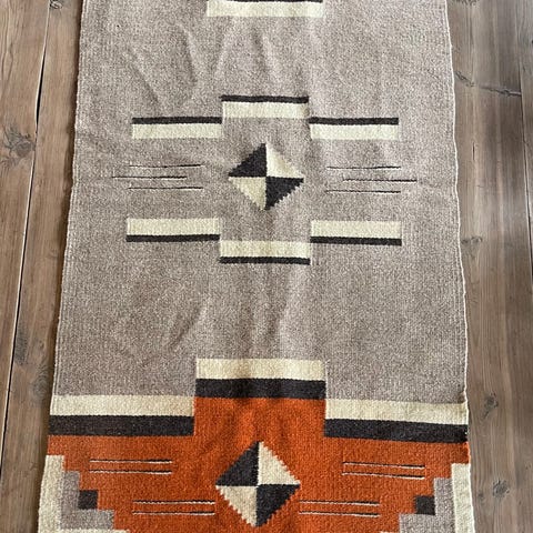Vakker stor løper i farger som også går inn i dagens interiør.Ikke de mest vanlige fargene ,det gjør denne løperen unik. Ingen feil eller flekker. Vevd i ullgarn med bomull renning.Kan også brukes som åkle. Lik på begge sider. Fra 50 tallet.