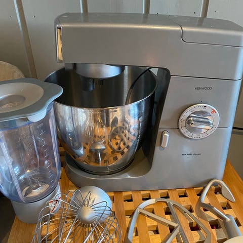 Kenwood major kjøkkenmaskin med tilbehør inkludert visp og eltekrok. Maskinen leveres med en stor blandebolle i plast. Egnet for ulike kjøkkenoppgaver som visping og elting. Lite brukt.