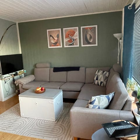 Det er noe nedsitting mellom to av sofaputene, men dette påvirker ikke bruken og sofaen er fortsatt veldig komfortabel å sitte i.