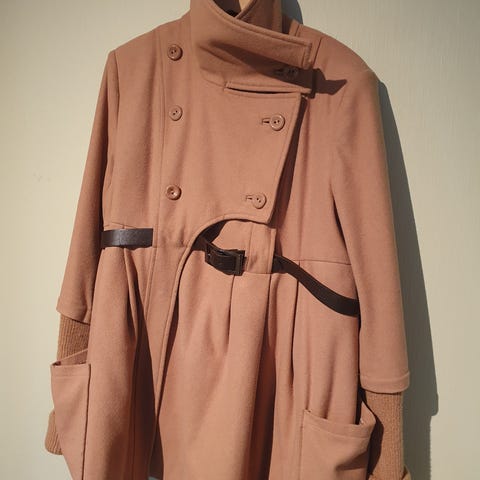 Sennepsgul jakke i myk kasjmir med plass til en voksende mage. Passer aller best i mellomsesong eller milde vinterdager. Jeg har brukt den noen få ganger, samme gjelder personen som eide den før meg.
