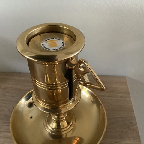 Lysestakei kobber og messing med detaljerte ornamenter og håndtak i messing,