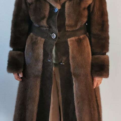 Nydelig minkpels i mellombrun pels merket Saga Selected; mink from Skandinavia. Minkhouse Falkonerallé København.