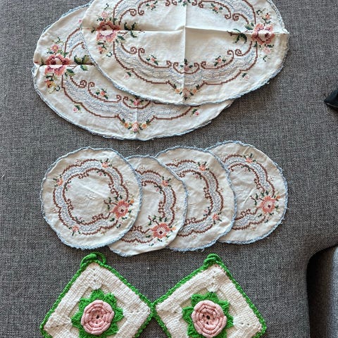 3 håndbroderte duker til soveromsmøblene el andre steder.