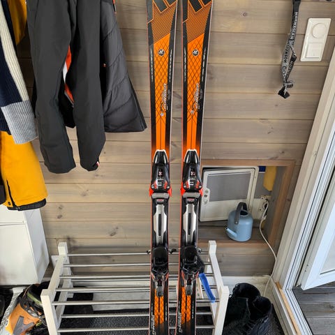 Stockli GS Race alpinski i rød farge. Passer for alpinbruk med fokus på racing. Skiene har bindinger montert.