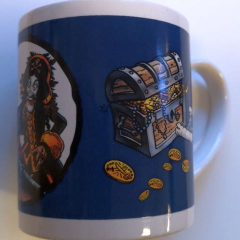 Tøff Kaptein Sabeltann kopp med hank i porselen. Motiv av blant annet Den Sorte Dame.