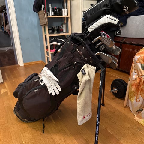 Stilren og solid Ogio Shadow golfbag i grønn farge. Bagen er kun brukt et par runder på banen i høst og fremstår som svært pen og lite brukt.