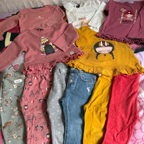 Selger en klespakke til jente. Klærne er i god brukt stand, men noen få plagg har små flekker. Passer godt til barnehagebruk. Størrelse hovedsakelig 12 måneder, med 2–3 plagg i størrelse 80.