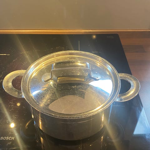 Scanpan gryte/panne i rustfritt stål med glasslokk. Gryten har to håndtak og et lokk med håndtak.