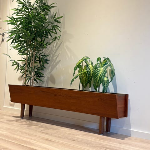 Blomsterbord i mørkt tre og rotting fra H&M home. Noen steder der fargen er slitt bort og noen hakk i treet - se bilder. Mål: 27x65 cm, 59.5 cm høyt.