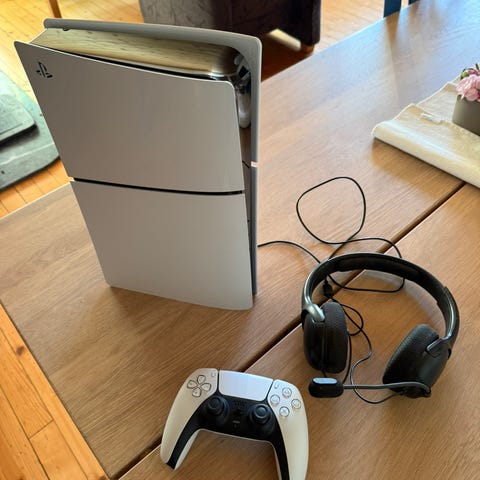 Selger en PlayStation 5 Slim, kjøpt ny hos Power i oktober 2025 for 6 600 kr, sammen med HyperX headset med mikrofon, kjøpt hos Elkjøp i november 2025 for 899 kr.