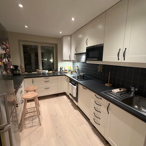 Eldre kjøkken gis bort med hvitevarer (komfyr, vifte og oppvaskmaskin) ved demontering. Kjøleskap følger ikke med.