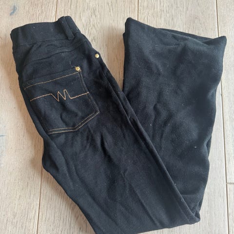 Pent brukt ulljeans frå Woolland, med hull oppe på vestre lår. Her kan det nok syes eller strykes merke på etter eget ønske. Eine søm nede høgre fot bak, er delvis løsna, sjå bilde.