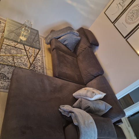 Sofaen er pent brukt, uten synlige merker, og fløyelsstoffet er både slitesterkt og lett å holde rent. Veldig myk og god å sitte i.
