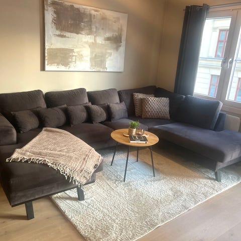 Selger vår flotte Copenhagen 5-seters U-formede sofa med divan og sjeselong, grunnet flytting. Sofaen er høyrevendt og trukket i mørk grå fløyel – et tidløst og elegant uttrykk som passer de fleste hjem.