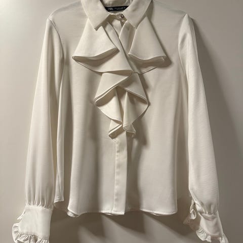 Bluse med blonder og bånd man kan bruke til sløyfe, henge rett ned eller ta deg av. Perlekapper på erme og i halsen.