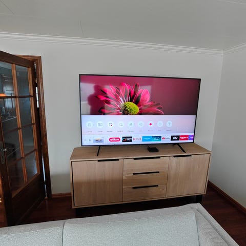 Philips 55PUS8100/12 55" LED-TV med 4K Ultra HD-oppløsning og Ambilight-teknologi som utvider fargene utover skjermens grenser. TV-en har HDR10+ støtte, Dolby Atmos og DTS:X lyd, samt innebygd Google TV med Google Assistant og stemmekontroll. Den støtter Apple AirPlay og har tre HDMI-innganger, to USB-porter, Wi-Fi og Bluetooth 5.0. Mål uten emballasje: 1226 x 705 mm (B x H), vekt 10,07 kg.