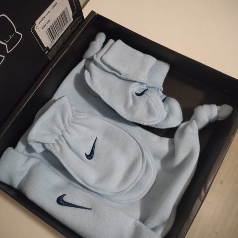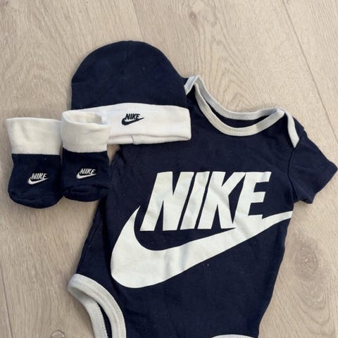 Nike 2-Piece Set for barn i størrelse 0-6 mnd. Sett består av lue og sokker i svart farge med grå detaljer. Laget av bomull. Passer for alle barn