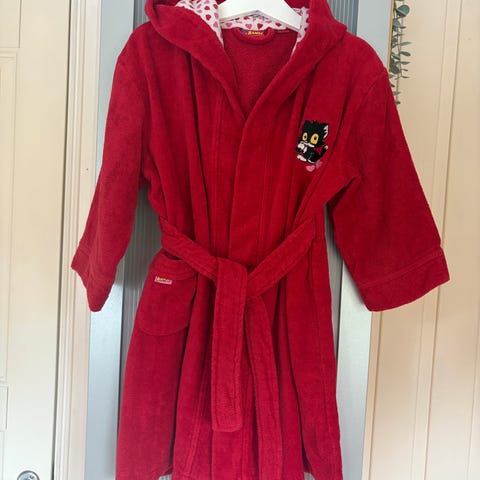 Blå badekåpe for barn, laget av tykk bomull. Badekåpen har hette og belte, med broderte bilmotiver på lommer og bryst.