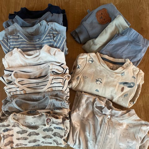 - 23 bodyer, inkludert én i ull (noen er i str. 74 fra Zara, men de er så små at de tilsvarer 68)