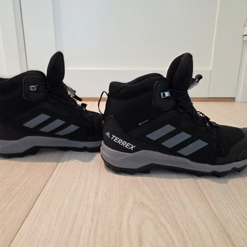 Adidas Terrex barnesko i størrelse 38, unisex. Skoene har en kombinasjon av materialer med vanntett Rain.RDY-teknologi, og er designet for å gi beskyttelse og komfort i ulike værforhold.
