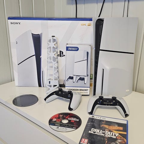 PlayStation 5 disc versjon spillkonsoll med to trådløse kontrollere i svart og hvit farge. Konsollen er nesten ikke brukt og medfølger disc drive.