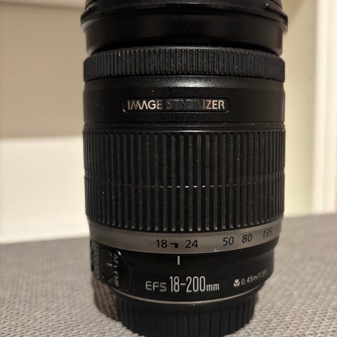 Canon EF-S 18-135mm objektiv med bildestabilisator og Nano USM motor. Objektivet har en zoomrekkevidde fra 18 til 135 mm og passer til Canon-kameraer med EF-S-fatning.