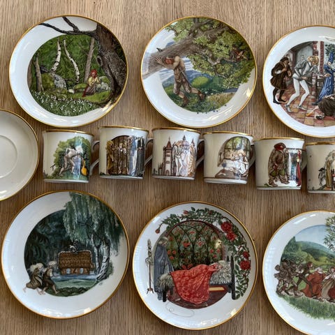 Selger et nydelig og svært dekorativt vintage kaffesett/tesett. Settet består av 6 kopper i dyp smaragdgrønn farge med detaljerte holdere i gullfarget metall utformet som drager. Det følger med 6 matchende asjetter med dragemotiv og original eske.